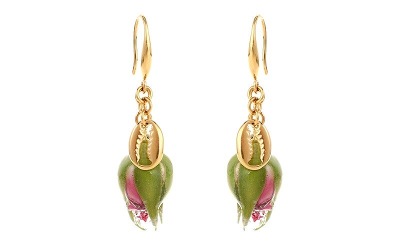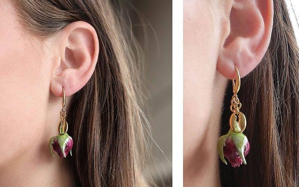 Deze gouden oorbellen zijn gemaakt van hoogwaardig 14K gold plated stainless steel en bevatten met zorg verwerkte echte rozenblaadjes. Elk paar is uniek – geen enkel blaadje is hetzelfde – wat zorgt voor een natuurlijke en betoverende uitstraling.