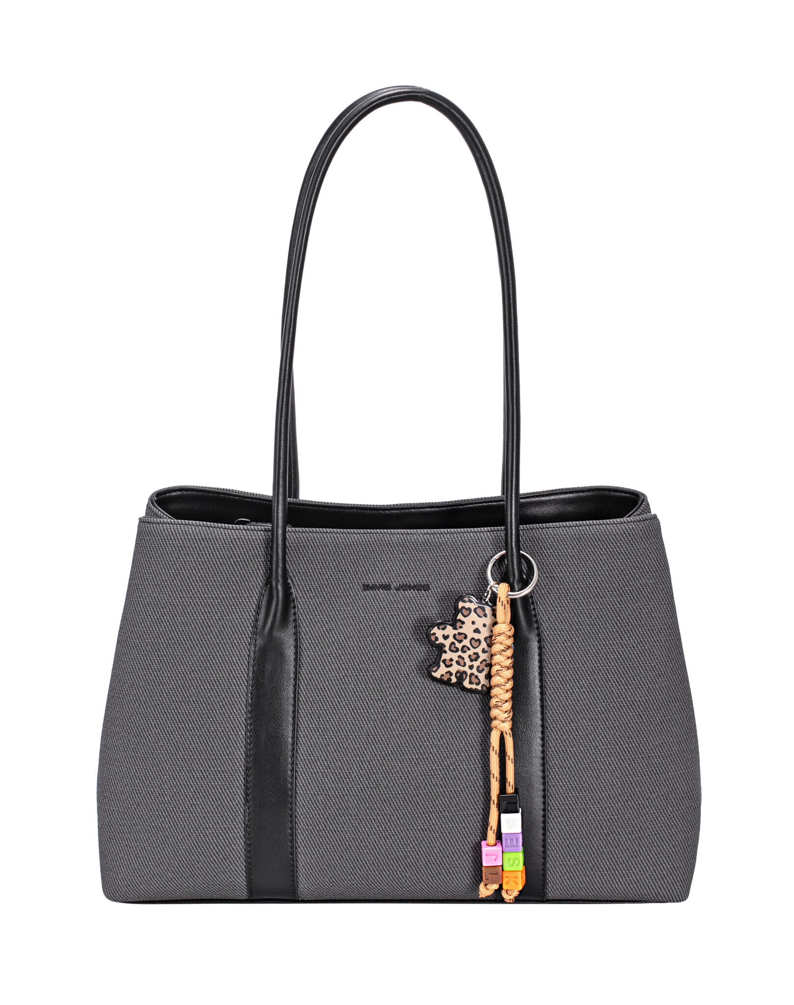 Elegante shopper met gevlochten stro-look materiaal, vegan leren accenten, ruim interieur, lichtgewicht gevoel, perfect shoppen en dagelijks gebruik.